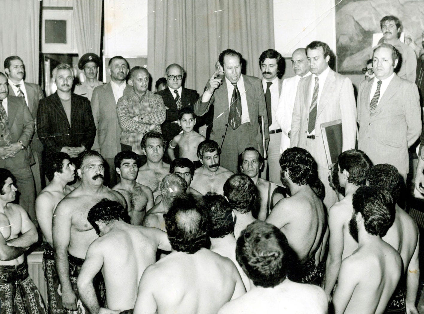 Sadegh Ghotbzadeh Visits a Zoorkhaneh of Tehran, 1979, photograph, Wikimedia Commons, https://commons.wikimedia.org/wiki/File:Sadegh_Ghotbzadeh_visits_a_zoorkhaneh_of_Tehran,_1979.jpg.
