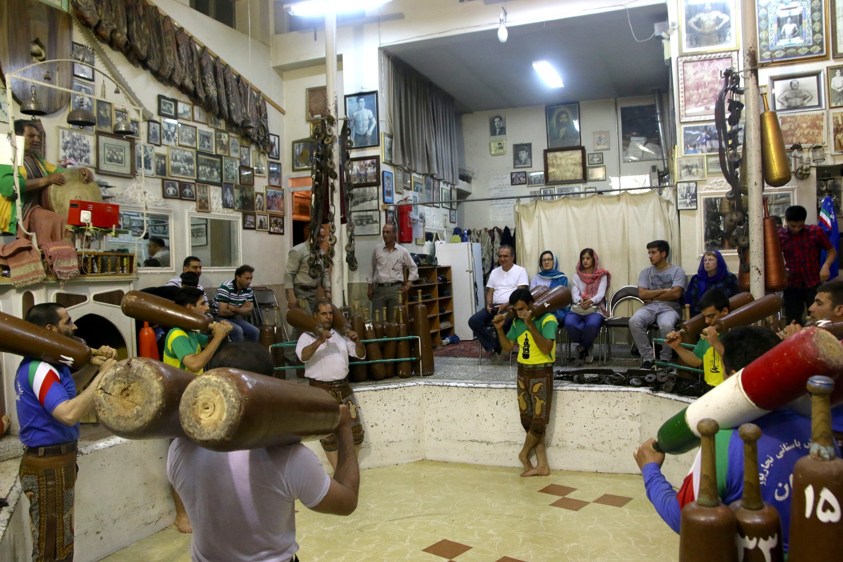 Tu Manling, Regular Practice of Zurkhaneh in Isfahan, photograph, May 27, 2016, Wikimedia Commons, CC BY-SA 4.0, https://commons.wikimedia.org/wiki/File:Regular_Practice_of_Zurkhaneh_in_Isfahan.jpg.